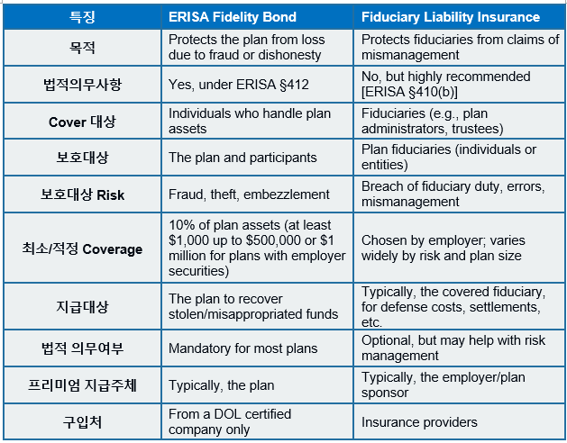ERISA Fidelity Bond 와 Fiduciary Liability Insurance 의 차이점