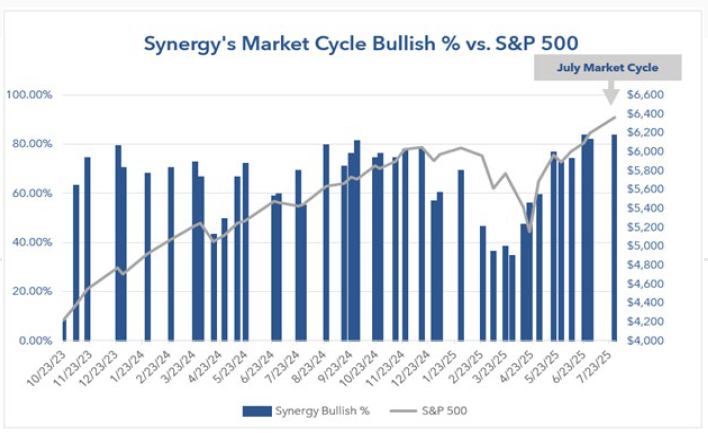 7월에 시장은 4월의 매도세 이후 회복세를 이어가며, 미국 주요 지수들이 새로운 사상 최고치를 경신했다. 당사의 시장 사이클 평가는 강세 82.8%, 약세 17.2%를 기록했으며, 강세 요인은 53개, 약세 요인은 11개로 집계됐다. 해당 모델은 5월 중순 이후 70% 이상을 유지해 오며, 기초 여건의 지속적인 강세를 나타내고 있다.