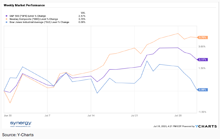 미국 주식시장은 7월에 상승세를 기록했으며, S&P 500과 나스닥 종합지수 모두 월 중 여러 차례 사상 최고치를 경신했다. 시장은 지속적인 회복세를 보여주는 경제 지표와 함께, 높은 관세율이 아직까지 성장세를 유의미하게 저해하지 않았다는 신호에 긍정적으로 반응했다. 이 상승세는 월말 발표된 예상치를 웃도는 2분기 GDP 보고서로 마무리되었으며, 이는 투자자 신뢰를한층 강화했다. 7월 한 달 동안 나스닥 종합지수는 3.7% 상승했고, S&P 500 은 2.17% 올랐으며,다우존스 산업평균지수는 0.08% 상승했다.