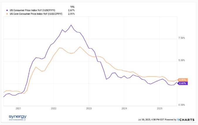 그럼에도 불구하고 우리는 계속해서 신중한 낙관론을 유지하고 있다. 무역정책은 여전히 변동성의 잠재적 원인으로 작용하며, 뉴스 헤드라인과 관세율의 잦은 변동은 4월에서 보았듯 갑작스러운 시장 모멘텀의 변화를 초래할 수 있다. 인플레이션 압력 또한 상승하고 있는데, 6월의 예상보다 높은 CPI 보고서에 따르면 헤드라인 인플레이션은 2.7%로 올랐다. 여기에 더해, 지정학적 사건 발생 가능성에 대한 경계가 여전히 필요하며, 이러한 사건들은 시장 심리를 언제든 급격하게 변화시킬 수 있다.
