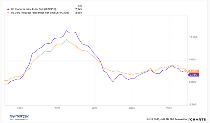 생산자물가지수(PPI)는 6월에 변동이 없었으며, 예상치였던 0.2% 상승을 밑돌았다. Core PPI 는 5 월의 2.8%에서 2.6%로 둔화되며 도매 물가 상승세가 다소 완화됐다. 상품 가격은 에너지와 Core 상품이 주도하며 0.3% 상승했고, 서비스 가격은 숙박 및 운송 비용 하락으로 0.1% 하락했다.
