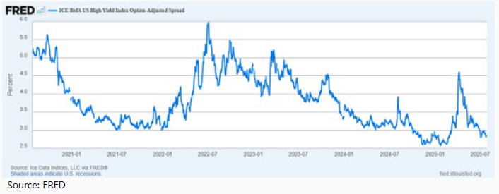 신용시장 위험을 측정하는 지표 중 하나인 ICE BofA High Yield Index Option-Adjusted Spread (OAS)는 투자자가 미 국채 대신 투자등급 미달 채권(below-investment-grade bond)을 보유하기 위해 요구하는 추가 수익률을 나타낸다. 스프레드가 확대되면 신용위험과 부도 가능성에 대한 우려가 커진 것이고, 축소되면 투자자 신뢰와 경제 전망이 개선된 것이다.