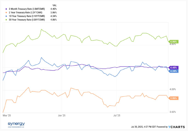 변동성이 컸던 6월, 국채 수요 변화와 안전자산 선호로 금리가 흔들린 이후, 7 월에는 보다 차분하면서도 혼조된 금리 움직임이 나타났다. 10 년물 수익률은 약 4.35% 수준에서 안정됐고, 단기 및 장기물 수익률은 소폭 상승했다.