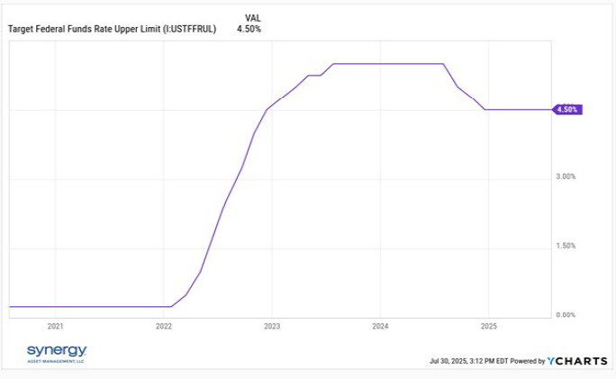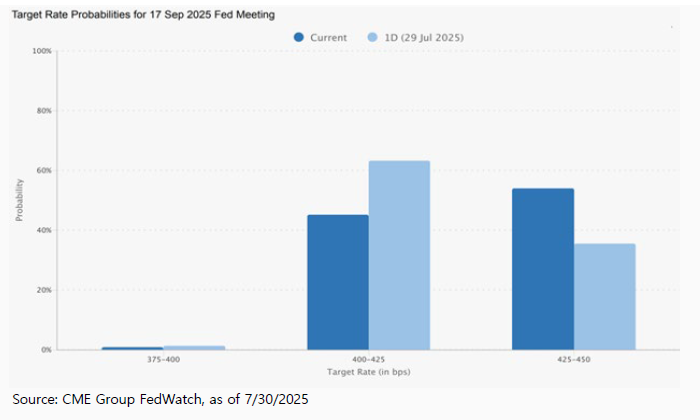 7 월 회의에서 연방준비제도(Fed)는 기준금리를 4.25%~4.50% 범위로 유지하며, 2024 년 12 월 이후 이어진 동결 기조를 연장했다. 이 결정은 이미 시장에서 널리 예상되었으며, 회의 전까지 시장은 금리 인하 가능성을 매우 낮게 반영하고 있었다.