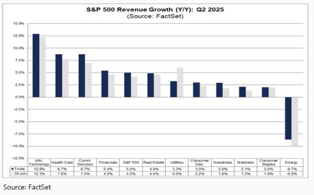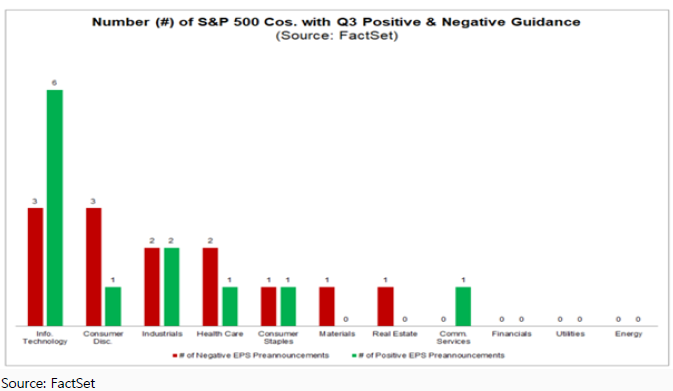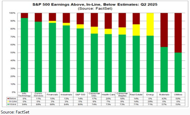 S&P 500 기업 중 34%의 조기 실적 발표에서 기업들은 성장 둔화 속에서도 견고함을 보였다. S&P 500 의 이익 성장률은 6.4%를 기록해 6 월 30 일 예상치인 4.9%를 웃돌았으며, 80%의 기업이 EPS 전망치를 상회해 2023 년 3 분기 이후 최고 기록을 세웠다.