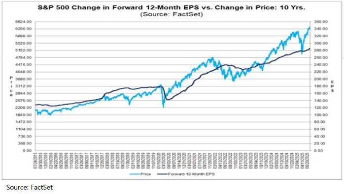 시장 밸류에이션은 낙관적인 성장 기대를 반영하지만, 이는 조정 위험 또한 내포한다. 12 개월 선행 P/E Ratio 는 22.4 로 5 년 평균(19.9)과 10 년 평균(18.4)을 모두 웃돌고 있다. 분기 말 22.1 에서 지수가 2.6% 상승하고 선행 EPS 추정치가 1.3% 상승하면서 P/E Ratio 가 상승했다. 현재 후행 P/E Ratio 는 27.9 이며, 애널리스트들은 9%의 가격 상승을 예상하고 있어, 경제나 시장 여건이 약화될 경우 급격한 매도세를 촉발할 수 있다.