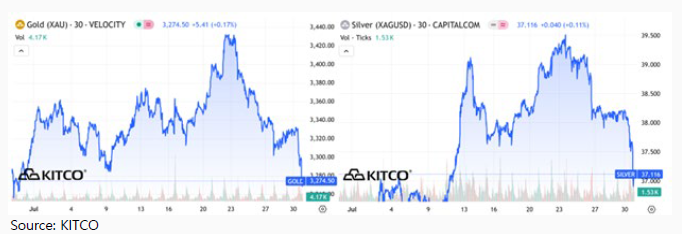 7 월 하반기 재정 불확실성 속에서 투자자들이 안전자산을 찾으며 금과 은 가격은 급등했다. 금-은 비율은 은의 산업 수요 증가로 인해 잠시 90 아래로 떨어졌다. 그러나 7 월 말로 가면서 위험 심리가 안정되고 주식이 반등하며 신용 불안이 완화되자, 귀금속 가격은 횡보세를 보이며 방어적 포지션을 취할 긴급성이 줄어들었다.