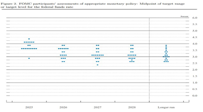 금리 결정과 함께 연준은 최신 경제전망요약(SEP)을 발표했다. 이 보고서는 금리, 인플레이션, 고용, 성장 전망을 담고 있다. 점도표(dot plot)는 대부분의 정책위원들이 올해 추가 금리 인하를 최소 한 차례 예상하며, 중앙값은 25bp 인하 두 차례 혹은 50bp 한 차례를 가리켰다.