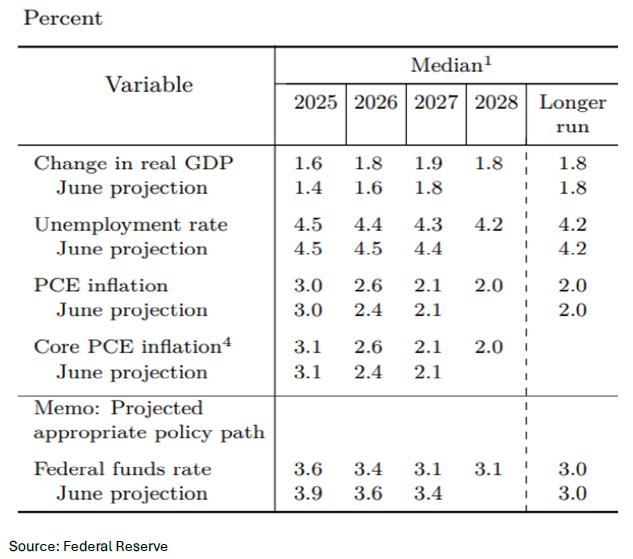 연준은 9월에 예상대로 기준금리를 25bp 인하했다. 이는 2024년 12월 이후 첫 금리 인하다. 정책위원 대부분이 이에 동의했으며, 단 한 명만이 반대했다. 시장은 이미 이를 예상했으나, 투자자들의 관심은 이제 연준의 향후 행보에 쏠리고 있다. 연말 전 추가 완화가 있을 가능성이 높다는 자신감이 커지고 있다.