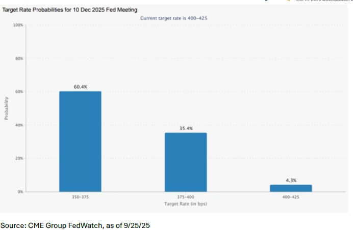 선물시장 역시 연준 전망과 대체로 일치한다. 9월 25일 기준, 시장은 연말까지 25bp 두 차례 혹은 50bp 한 차례 인하할 확률을 60.4%로 반영했다. 단 한 차례 인하 가능성은 35.4%였으며, 추가 인하가 없을 가능성은 4.3%에 불과했다. 이는 시장이 연내 추가 인하 가능성을 강하게 보고 있음을 뜻한다.