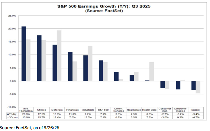 S&P500의 이익 성장은 3분기에 가속화될 것으로 예상된다. 이는 이전 전망보다 소폭 개선된 것이다. 9월 26일 기준, 애널리스트들은 3분기 이익이 전년 대비 7.9% 증가할 것으로 예상했는데, 이는 6월 말 전망치 7.3%에서 상향된 수치다. 매출 성장은 6.3%로, 6월 당시 4.8%에서 상향 조정되며, 불확실한 거시경제 환경 속에서도 기업 펀더멘털의 회복력을 보여주고 있다.