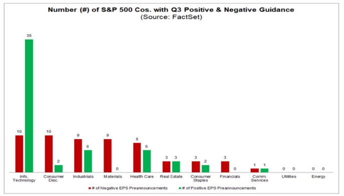 9월 26일 기준, 112개 기업이 3분기 EPS 전망치를 발표했으며, 이 중 긍정적인 가이던스는 56개, 부정적인 가이던스도 56개로 균형을 이뤘다. 그러나 긍정적 전망 기업 수는 5년 평균(42개), 10년 평균(39개)을 크게 웃돌았다. 특히 정보기술 섹터에서는 36개 기업이 긍정적 전망을 내놓으며 성장에 대한 자신감을 드러냈다.