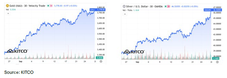 9월 금 가격은 사상 최고치를 경신했다. 이는 연준의 금리 인하와 각국 중앙은행의 실물 매입 강화에 따른 안전자산 수요 증가 덕분이다. 은 역시 새로운 사상 최고치를 기록했으며, 이는 태양광·전기차 산업 수요에 따른 구조적 공급 부족을 반영했다. 두 귀금속 모두 지정학적 긴장, 관세 위험, 경제 우려, 인플레이션 압력 등 복합 요인에 의해 지지되었다.
