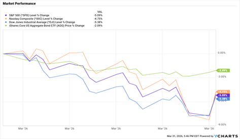 이란과의 분쟁 및 그 파급 효과로 인해 3월 내내 주식과 채권이 전반적으로 하락했다. 가치주 중심의 다우존스 산업평균지수(Dow Jones Industrial Average)가 5.38% 하락하며 가장 큰 낙폭을 기록했고, S&P 500이 5.09% 하락, 나스닥 종합지수(Nasdaq Composite)가 4.7% 하락했다. 3월 31일에 나타난 월말 반등으로 해당 지수들이 2~3% 수준을 회복하며 분쟁 완화에 대한 낙관론이 일시적으로 부상했고 손실 폭이 일부 제한됐다.
