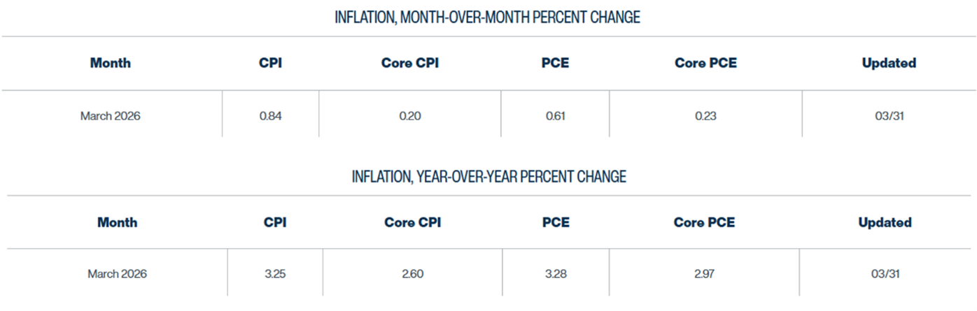 클리블랜드 연방준비은행(Federal Reserve Bank of Cleveland)의 나우캐스팅(Nowcasting) 모델은 3월 CPI가 전월 대비 0.8% 상승하여 연간 상승률이 약 3.25%에 달할 것으로 예측한다. 반면 근원 CPI는 월 0.2% 상승에 그쳐 연간 상승률이 2.6% 수준을 유지할 전망이다. PCE 인플레이션은 전년 대비 3.3%로, 근원 PCE는 약 3% 수준으로 상승할 것으로 예측된다.