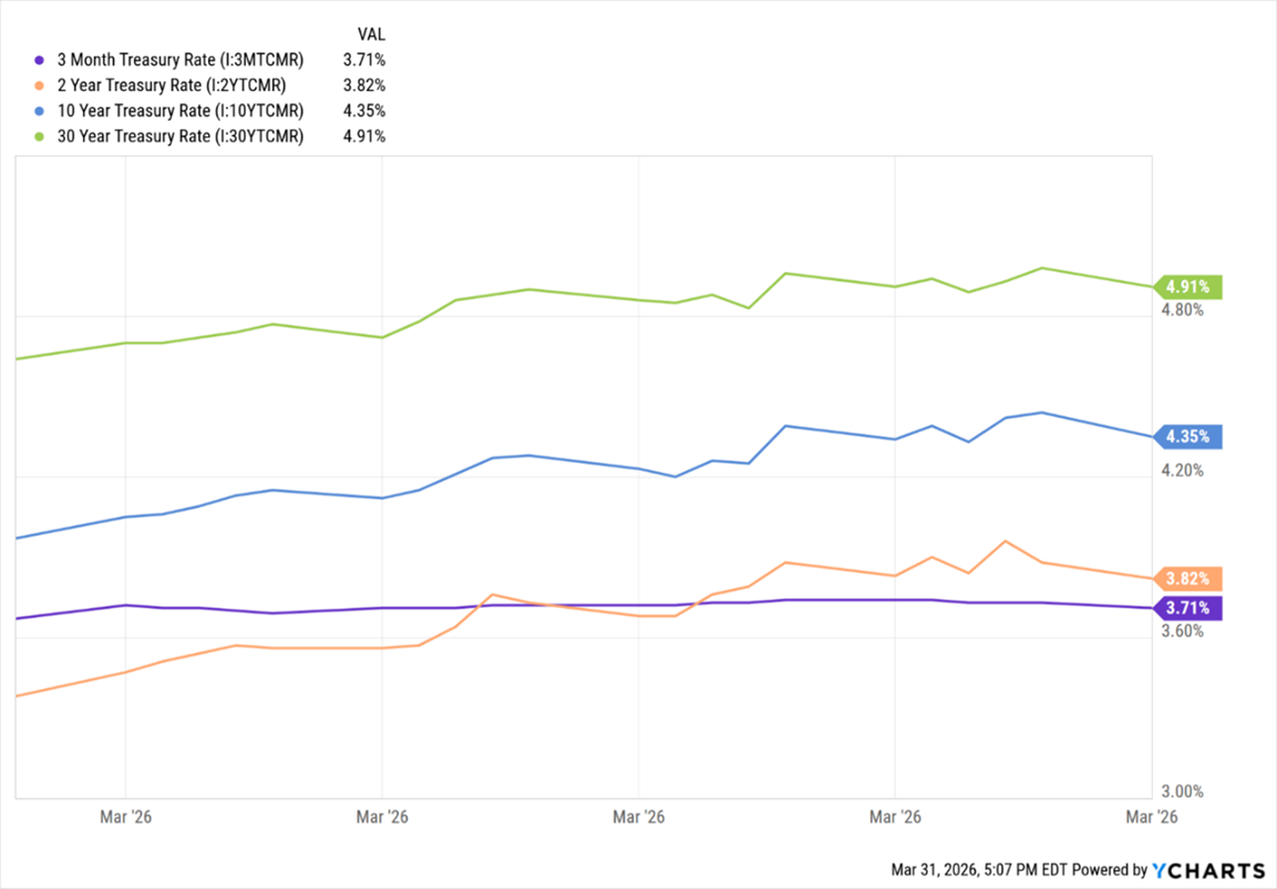 종합 요약 (Summary)3월 금융시장은 중동발 지정학적 긴장으로 인해 주식과 채권 모두에서 광범위한 시장 약세가 나타났다. 주요 3대 지수인 다우, S&P 500, 나스닥이 약 5% 하락한 가운데, 국채 금리는 전 만기 구간에서 상승 압력을 받았다. 특히 월중 발표된 인플레이션 데이터는 CPI, PCE, PPI 등 주요 물가 지표가 연준의 목표치를 상회하고, 에너지 가격마저 급등하면서 금리 인하 시점은 더욱 불투해진 상황이다. 다만, 이러한 최근의 변동성 확대와 지정학적 리스크 고조에도 불구하고, 기업의 펀더멘털은 여전히 견고하게 유지되고 있어, 다가오는 실적 시즌에 대한 긍정적 기대감은 여전히 유효하다.