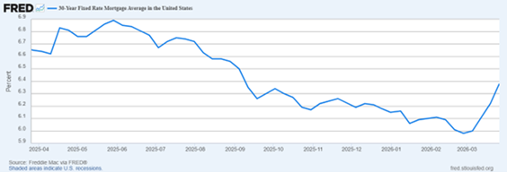 지난 한 해 동안 꾸준히 하락세를 보이던 모기지 금리가 이번 달 국채 금리와 함께 40bp(베이시스포인트) 상승했다. 월초 6% 아래로 내려가 주택 구매자들에게 반가운 소식을 전하던 모기지 금리는, 이란과의 분쟁으로 에너지 가격이 오르고 인플레이션 우려가 재연되면서 급등했다.30년 고정 모기지 금리는 2월 26일의 5.98%에서 3월 26일에는 6.38%로 상승하며, 불과 몇 주 만에 수개월간의 하락분을 모두 되돌렸다.