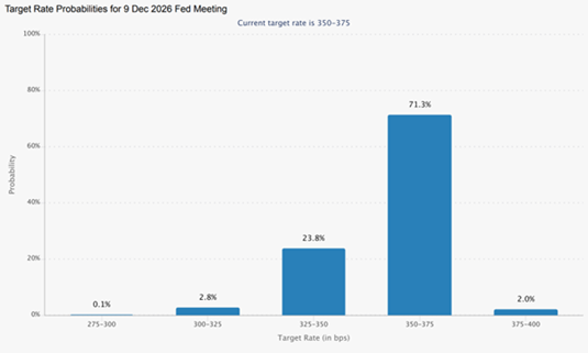 반면 선물 시장은 회의적인 시각을 유지하고 있으며, 월말 기준 확률은 다음과 같다.