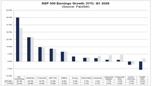 연간 컨센서스 전망으로는 애널리스트들이 2026년 EPS 17.1% 연간 성장과 매출 8.6% 성장을 예상한다. 지정학적 리스크가 시장 심리에 계속 영향을 미칠 수 있지만, 기업 이익은 향후 수개월간 주식시장에 견고한 기초적 토대를 제공하며 견조함을 유지할 것으로 기대된다.