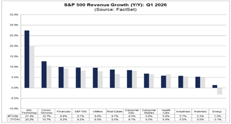 1분기 매출 성장은 기술 섹터를 선두로 커뮤니케이션 서비스와 금융 섹터가 뒤를 이으며, 보다 광범위한 섹터에 걸쳐 고르게 나타날 전망이다. 모든 섹터가 플러스 매출 성장을 기록할 것으로 예상되며, 이는 미국 대형 기업들의 건전한 펀더멘털을 보여주는 신호다. 에너지 섹터는 가장 느린 매출 성장이 예상되나, 이란과의 분쟁에 따른 원자재 가격 상승이 이미 전망치 상향 조정을 촉발하고있으며, 지정학적 압박이 지속되면 섹터에 추가 호재가 될 수 있다.