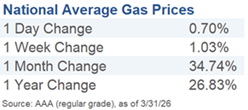 이란과의 분쟁 격화로 인해 3월 내내 에너지 가격이 급등했다. WTI 원유 선물은 우크라이나-러시아 전쟁 이후 약 4년 만에 처음으로 배럴당 100달러를 상회하며 마감했다. 소비자 주유소 유가는 월간 1달러 이상 급등해 한 달 전 대비 약 35%, 전년 동기 대비 26.8% 상승했다. 에너지 비용 상승은 향후 인플레이션 통계에 반영되며 소비자 예산에 부담을 주고 통화정책에 대한 시장의 단기 기대에도 영향을 미칠 가능성이 크다.