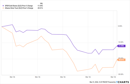 금과 은은 1월 말 고점 이후 이번 달에도 지속적으로 하락했다. 금(GLD)은 3월 중 최대 17% 하락했으며, 은(SLV)은 최대 28% 급락했다. 이번 하락은 그간의 상승분에 대한 차익 실현 매물과 금리 인상 기대감에 따른 비이자 자산의 매력 저하, 그리고 변동성 확대에 따른 레버리지 포지션 청산이 맞물린 결과이다. 역사적인 급등 이후 위험 회피 심리가 고조된 환경에서 나타나는 이러한 ‘냉각 기간’은 과거 사례에 비추어 볼때 이례적인 현상은 아니다.